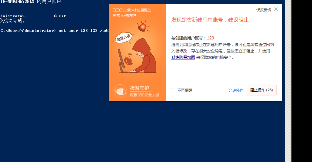 正常执行命令添加用户会被360拦截如图: